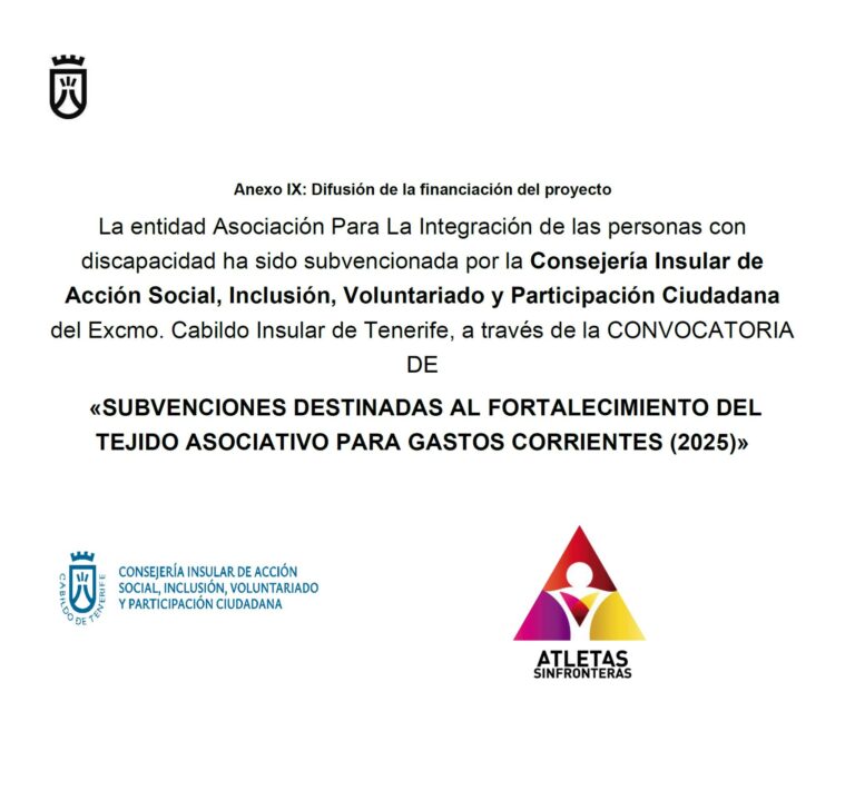 Nada de este impacto sería posible sin el respaldo de las instituciones públicas que creen en nuestro proyecto y en su dimensión social. Es por ello que queremos expresar nuestro más sincero agradecimiento al Cabildo de Tenerife, y en particular a su Área de Acción Social, Inclusión, Voluntariado y Participación Ciudadana, por el apoyo y las subvenciones concedidas, este año 2025 por un importe de 1.448,59€, que han sido fundamentales para el desarrollo y consolidación de nuestras iniciativas.